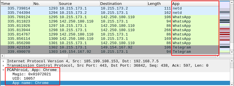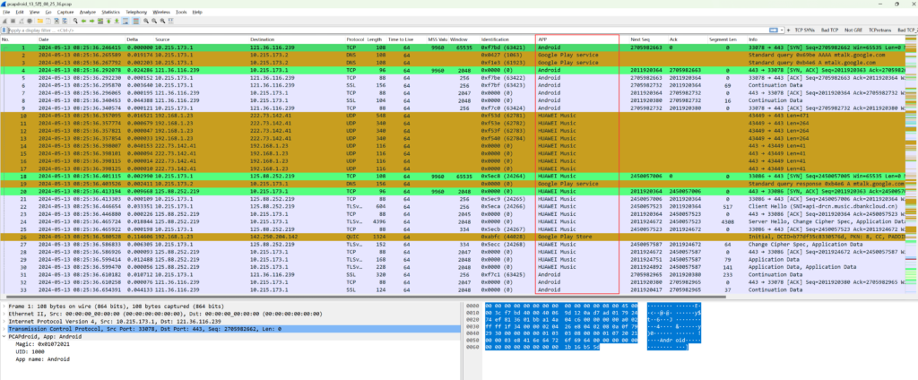 然后使用PCAPdroid抓包,转储为PCAP格式文件,用wireshark打开,可以看到可以正常显示每个连接来源的APP名称: