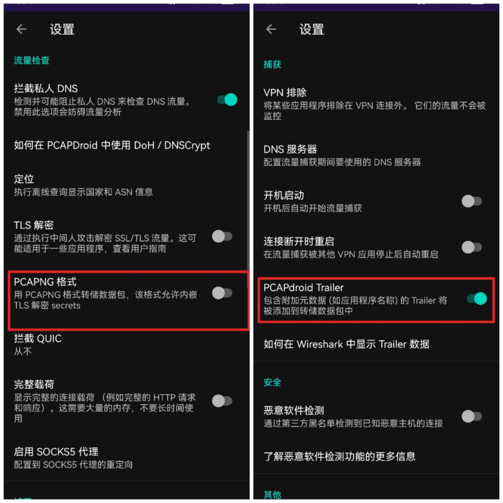 ①PCAPdroid开启了PCAPdroid Trailer选项,并禁用了PCAPNG格式(禁用PCAPNG格式依然不影响你转储PCAP格式文件):