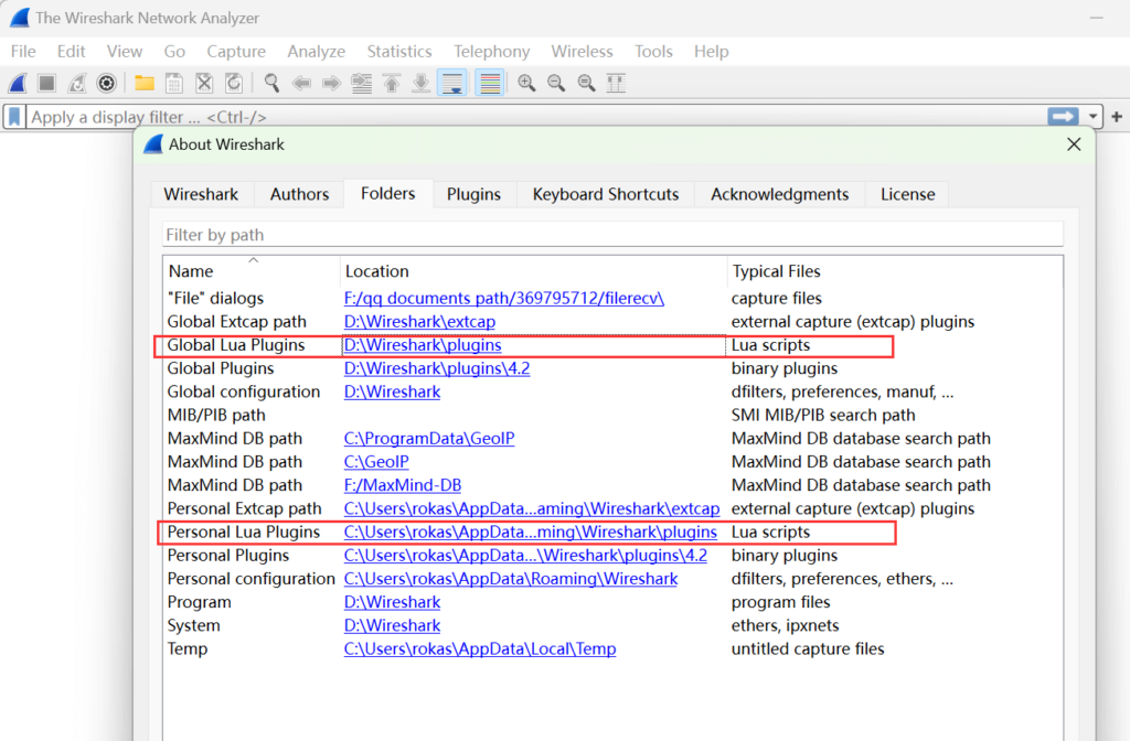 在本文安装章节,有下载链接,把脚本下载到本地后,点击wireshark的 Help(帮助) –> About Wireshark(关于wireshark) –> Folders(文件夹)选项,找到Lua插件目录,可以是全局Lua插件目录也可以是个人Lua插件目录: