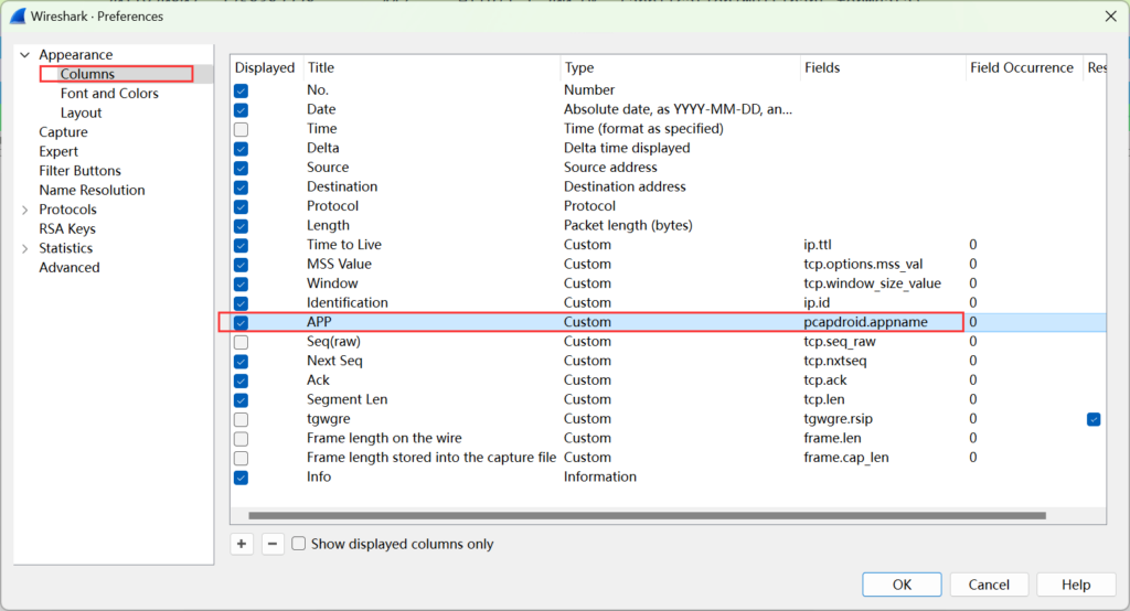之后在编辑选项里添加列,字段为pcapdroid.appname: