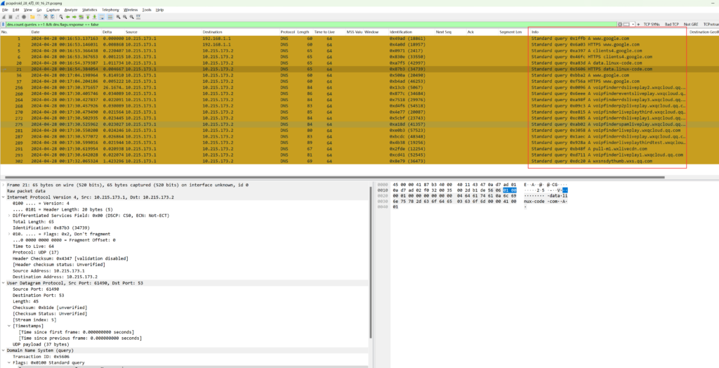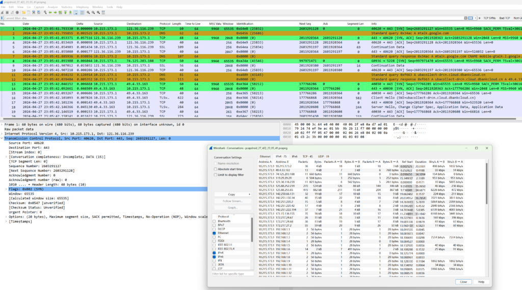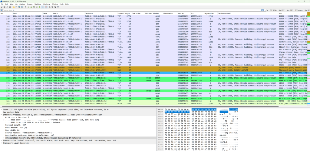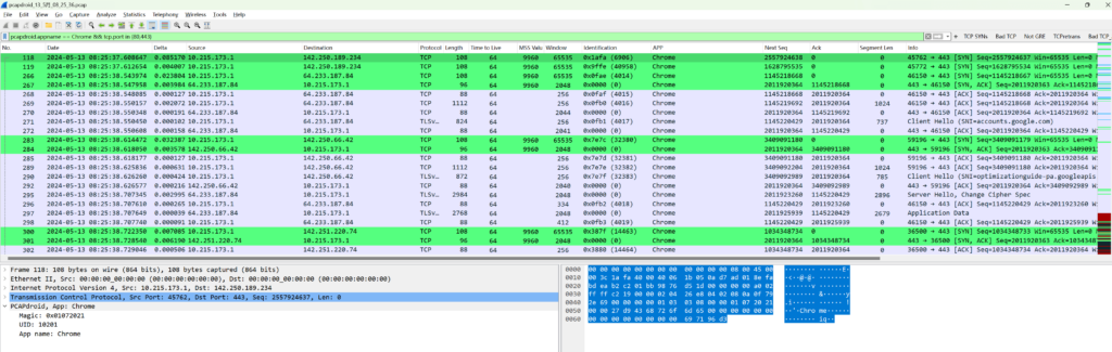 打开后是标准的数据包格式和完整交互的报文,包括TCP握手、DNS查询、TLS握手等,到这一步几乎已经秒杀目前市面上所有的安卓端抓包软件。