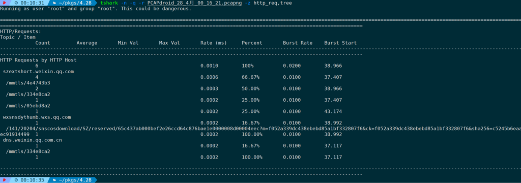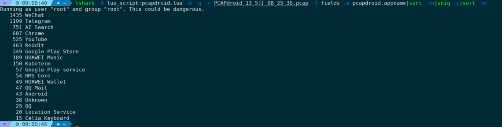 tshark -X lua_script:pcapdroid.lua -n -q -r <抓包文件> -T fields -e pcapdroid.appname|sort -rn|uniq -c|sort -nr
