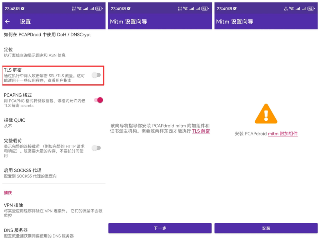 如需在手机内部看到HTTPS/TLS解密后的报文,还需附加组件PCAPdroid-mitm: