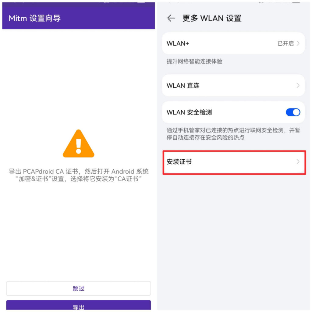 PCAPdroid mitm使用mitmproxy代理TLS会话,因此需要导出PCAPdroid mitmproxy的CA证书,并且在安卓系统设置里安装证书,证书名称任意: