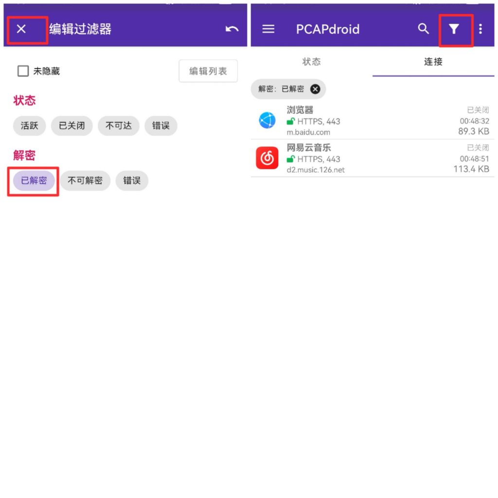 之后我们开始抓包,并且分别打开浏览器和网易云两个APP让其产生流量,再点击右图中的过滤器,选择左图中的已解密选项,即可过滤已解密的连接: