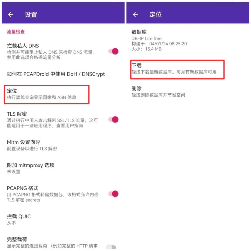 这是个离线数据库,存在手机内部,供PCAPdroid使用,不会调用任何第三方API接口查询IP归属地。