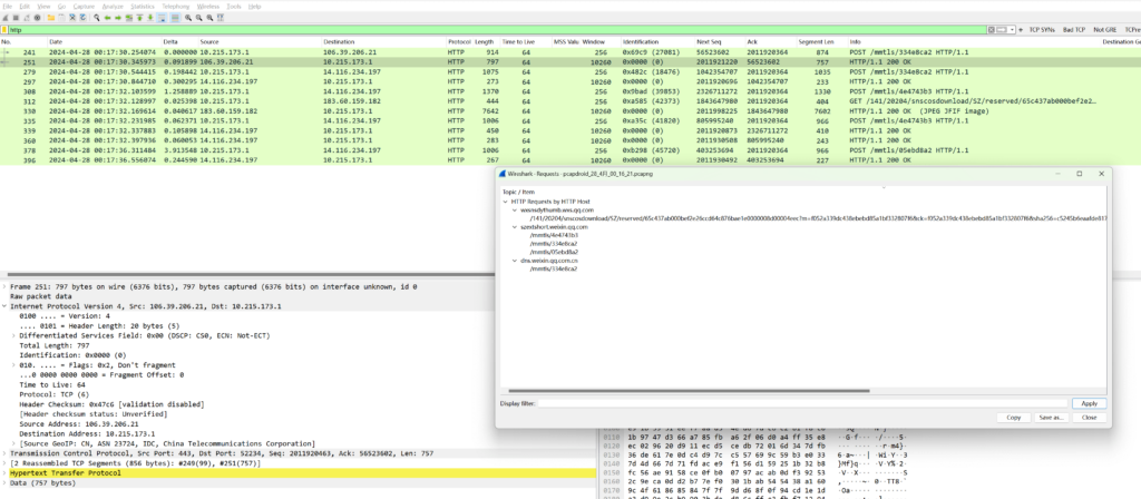 提取HTTP协议请求URL,在wireshark的Statistics(统计) –> HTTP –> Rquests(请求) 页面即可查询: