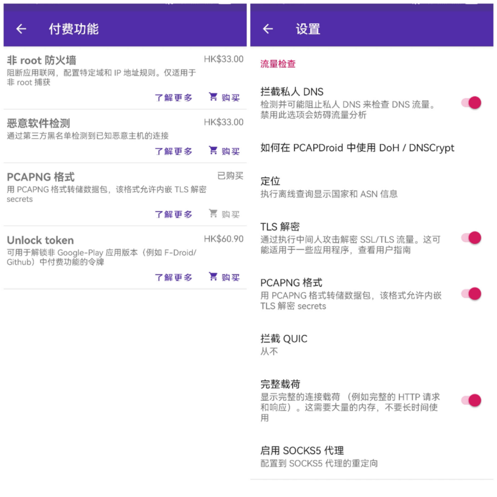 存储为PCAPNG格式,付费后解锁的功能,目前价格是13港币即可解锁,并且解锁后允许进行TLS解密,在设置里面勾选即可: